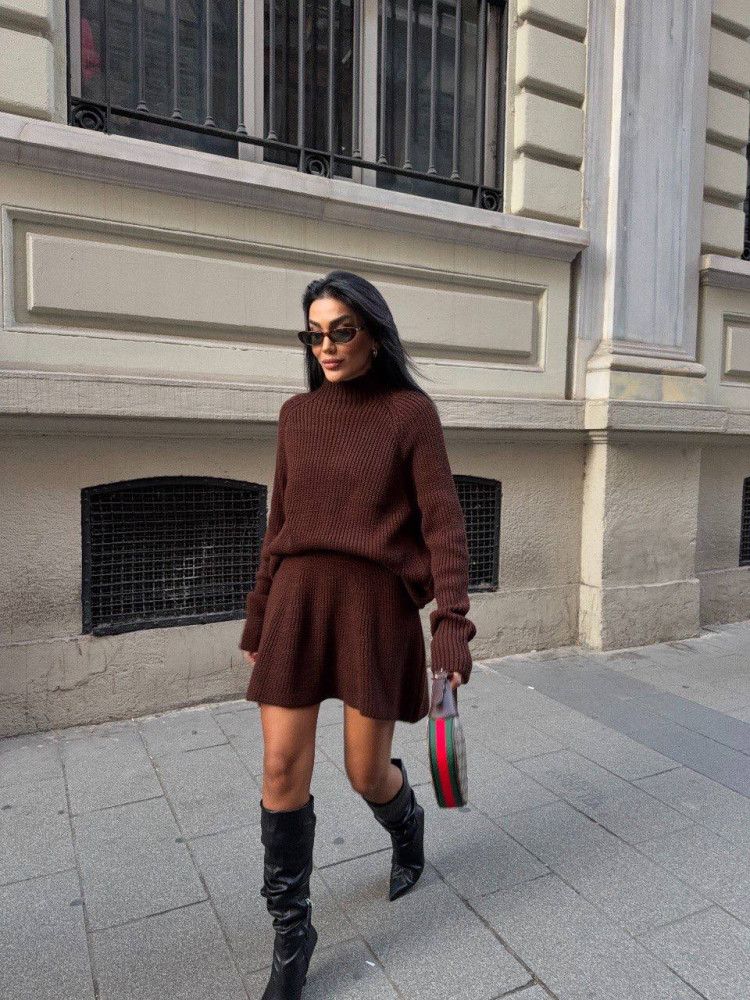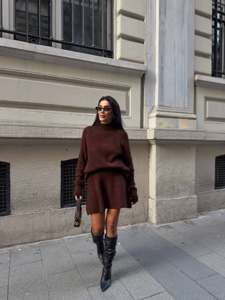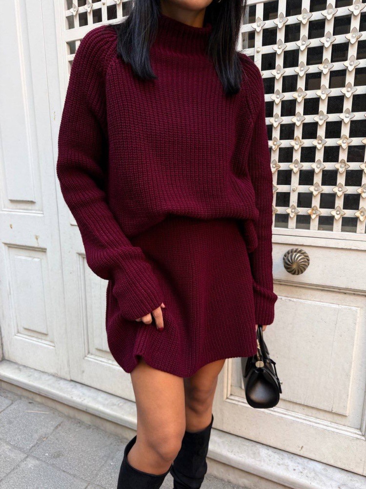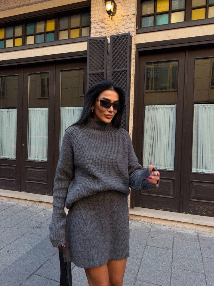 - Светр оверсайз із рукавом-реглан. Спідниця-трапеція