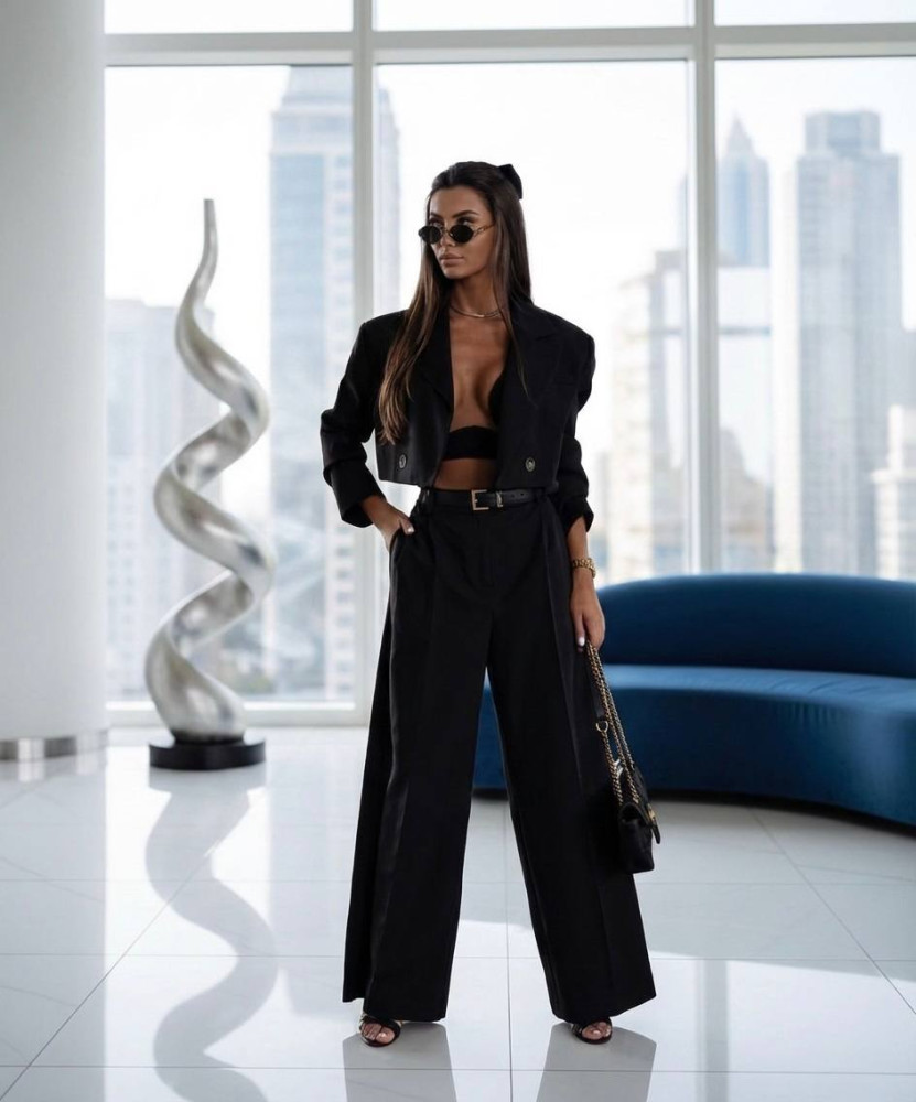 - Жакет застегивается на одну пуговицу. Брюки со шлевками, застежка на молнию и пуговица, сзади на поясе резинка