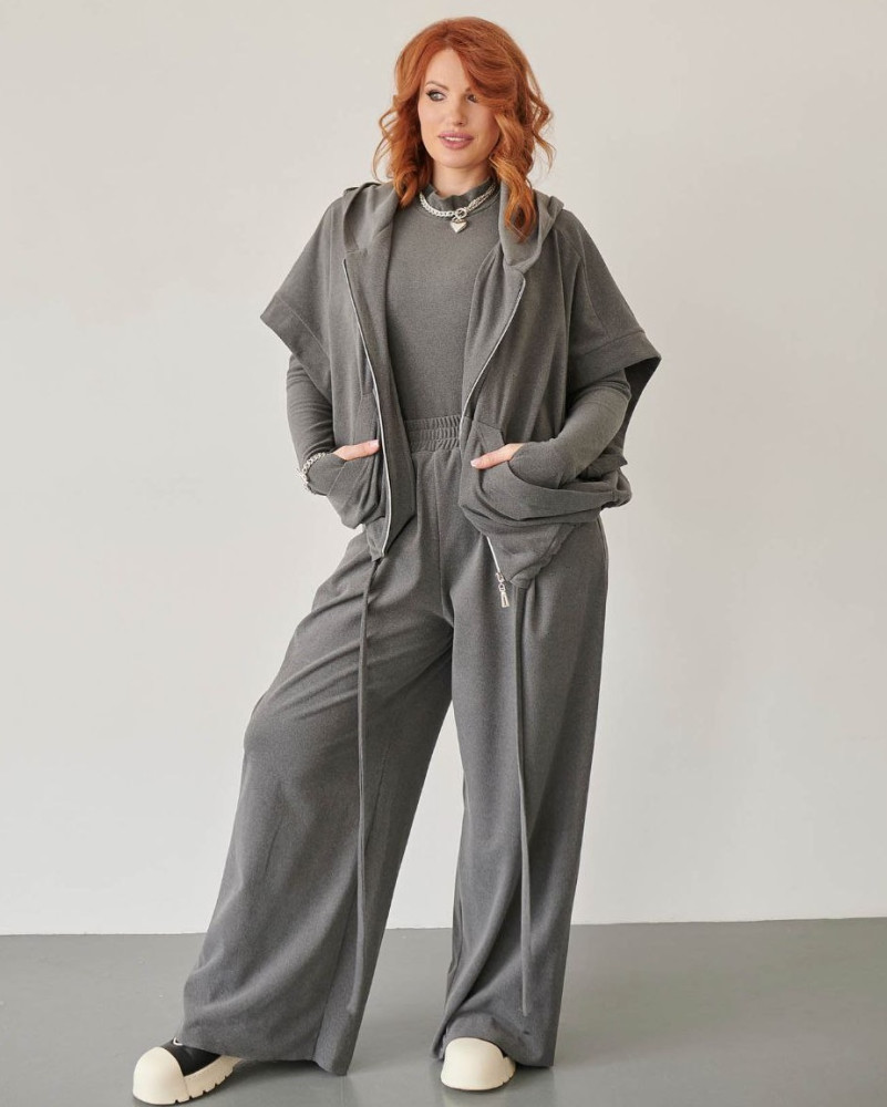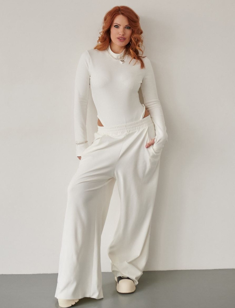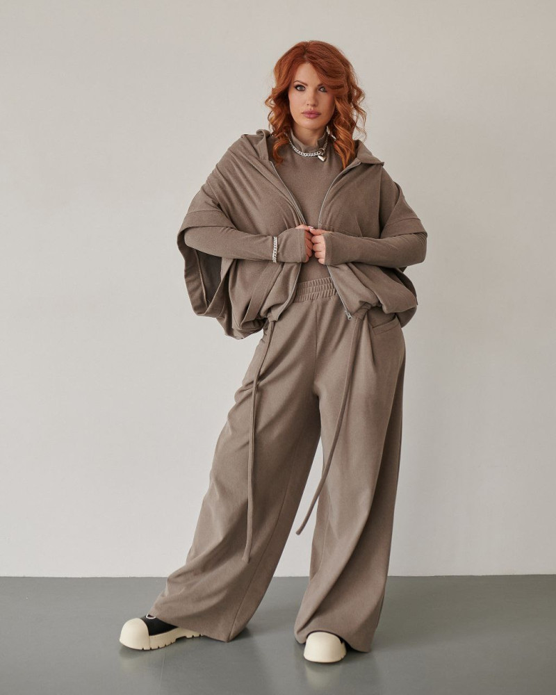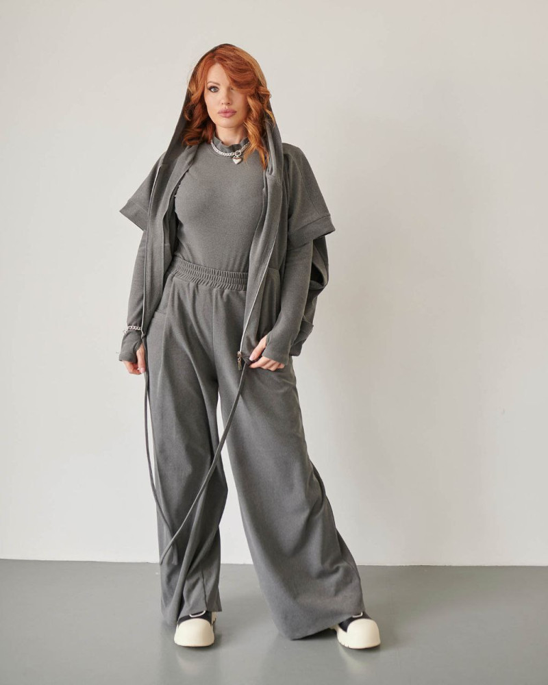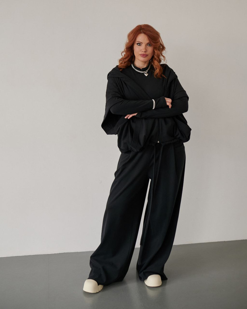 - Жилетка оверсайз, штаны палаццо, боди застегивается на кнопки, на рукаве есть вырез для пальчика