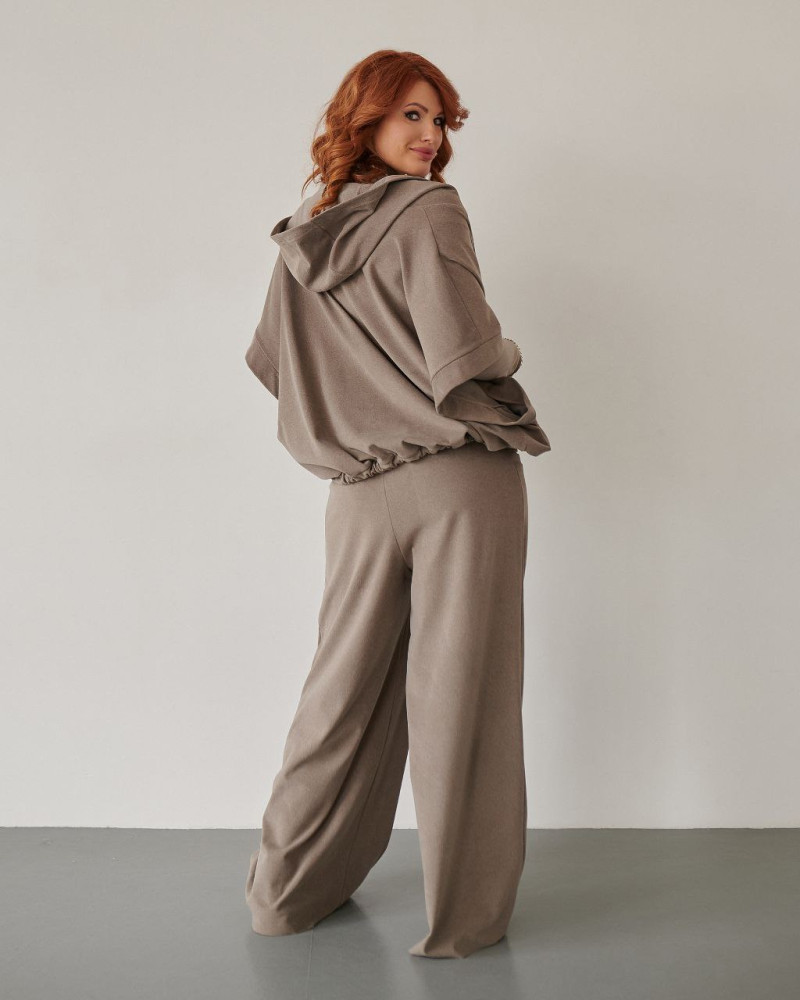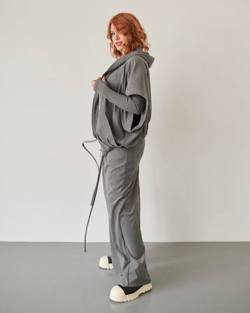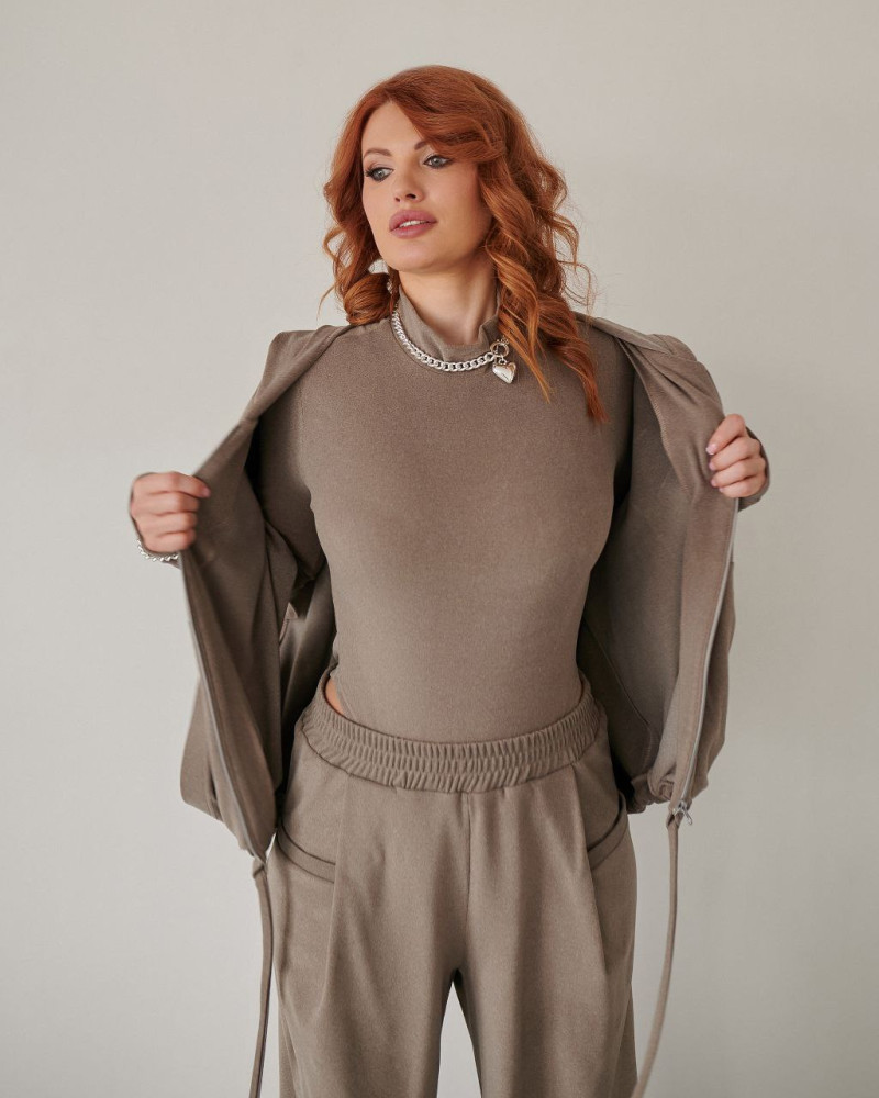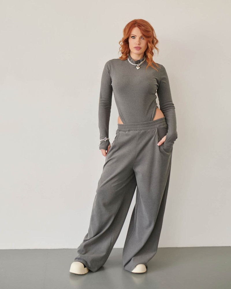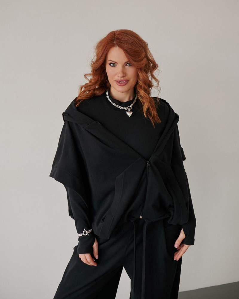 - Жилетка оверсайз, штаны палаццо, боди застегивается на кнопки, на рукаве есть вырез для пальчика