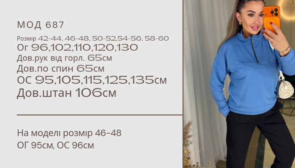 - ОГ 96см, Дов.по спине 65см, Дов.рукав 65см, ОС 95см, Дов.штанов 106 см