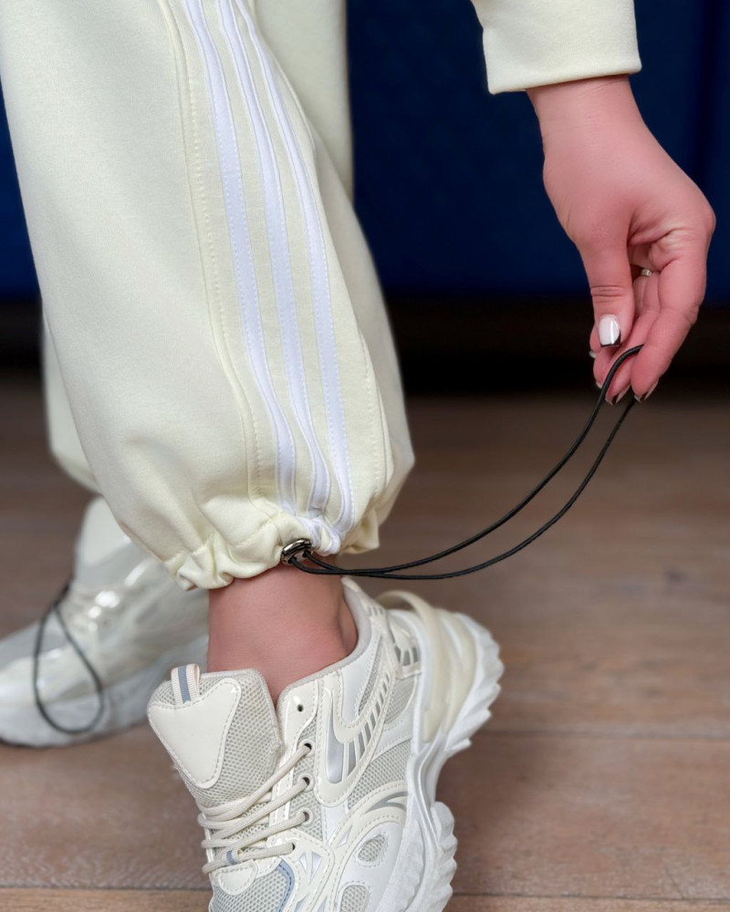 - Кофта имеет два кармана, по низу кулиска. Штаны – высокая посадка, низ с регулировкой