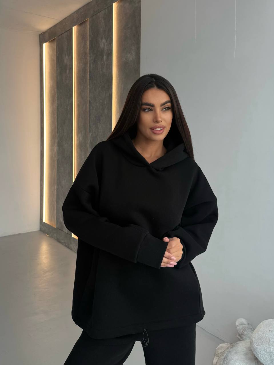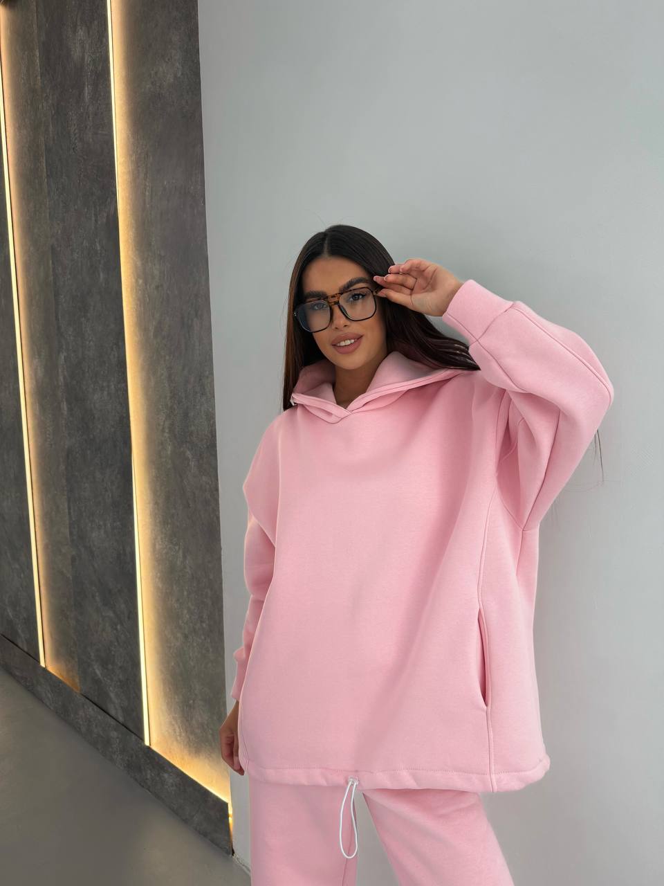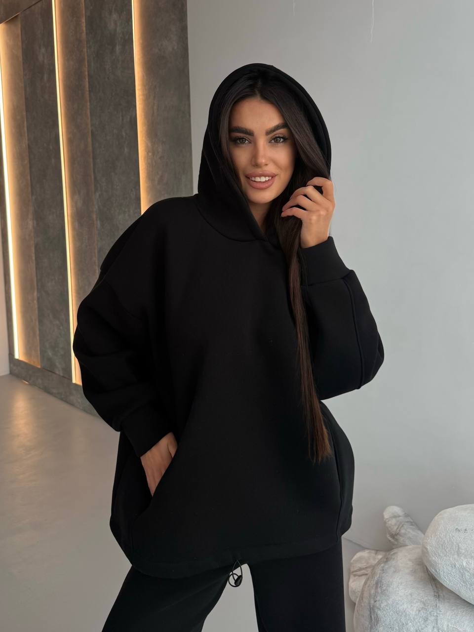 - Худи с двойным капюшоном, строчками, по бокам карманы, низ регулируется затяжками