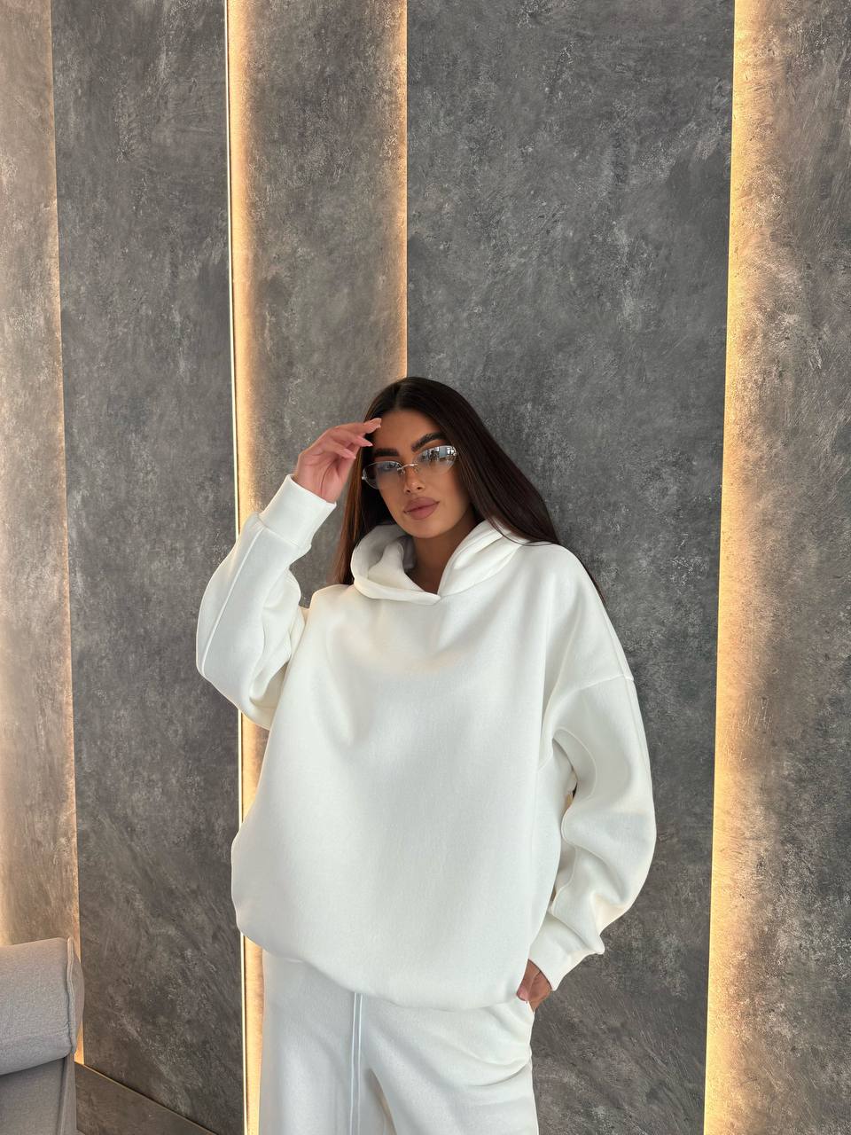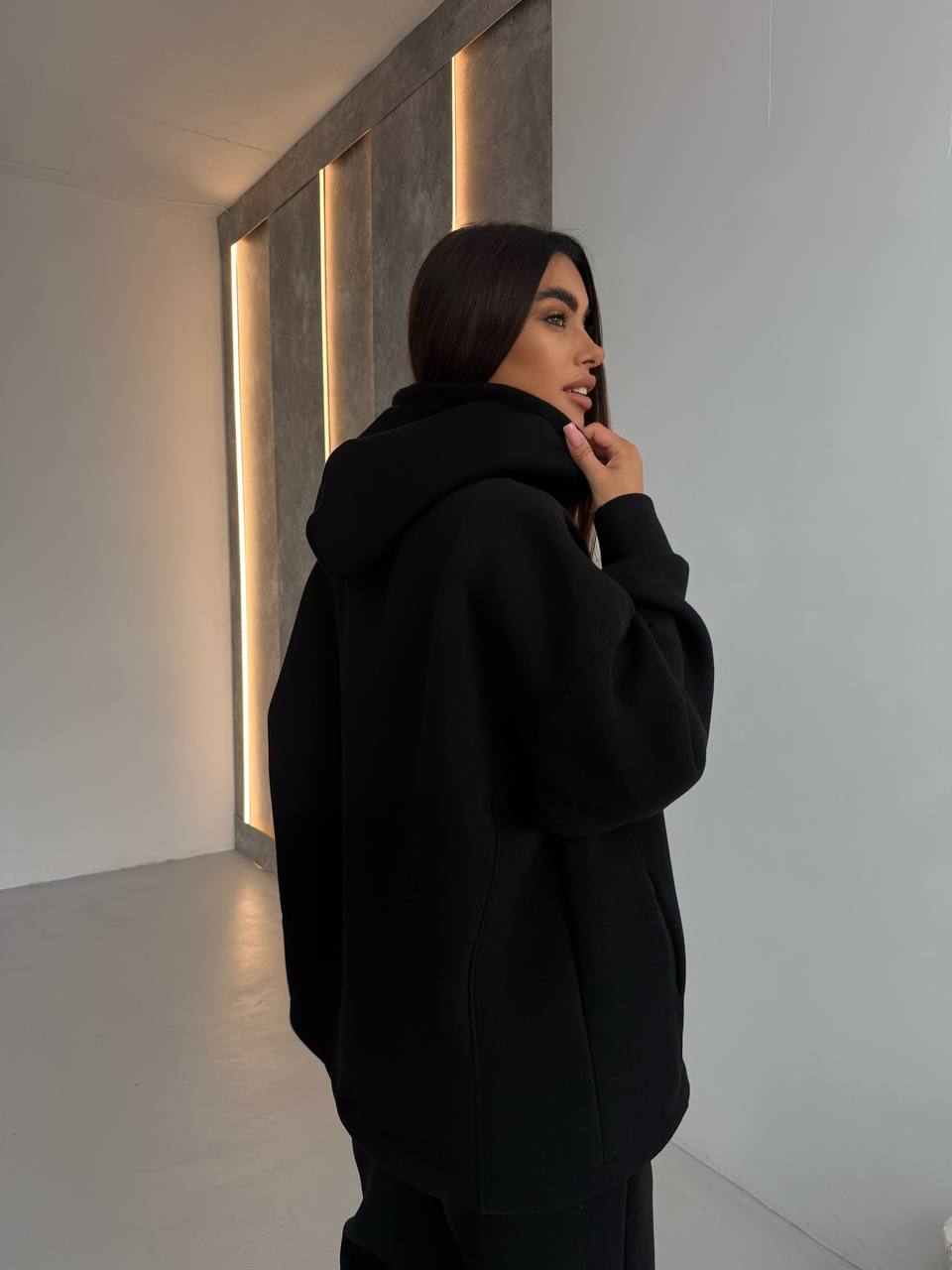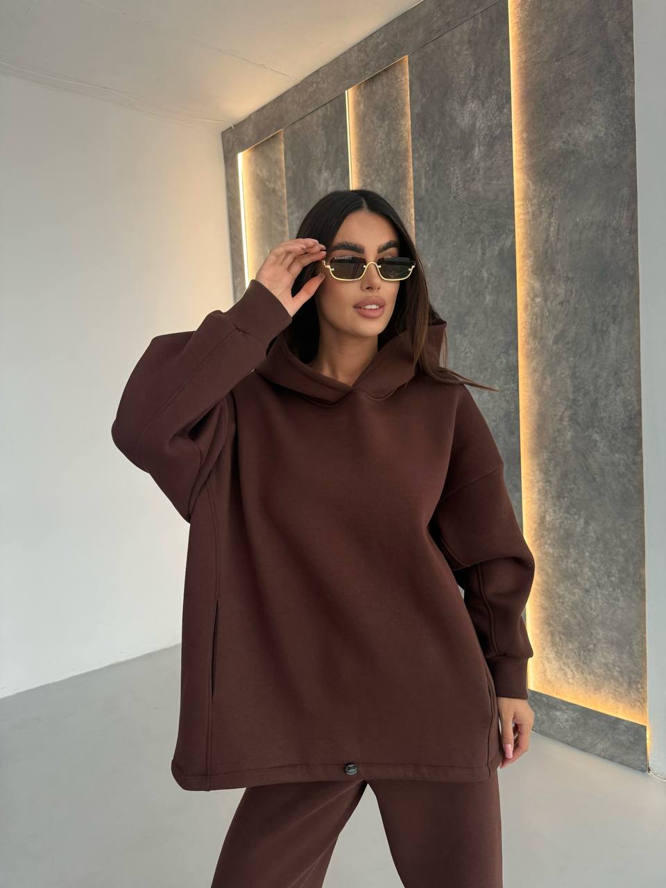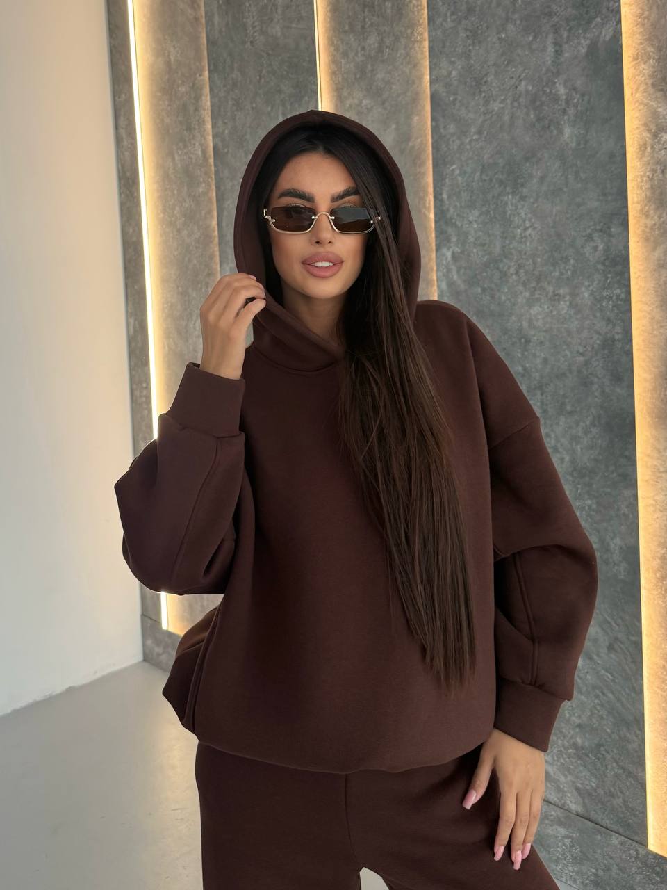 - Худи с двойным капюшоном, строчками, по бокам карманы, низ регулируется затяжками