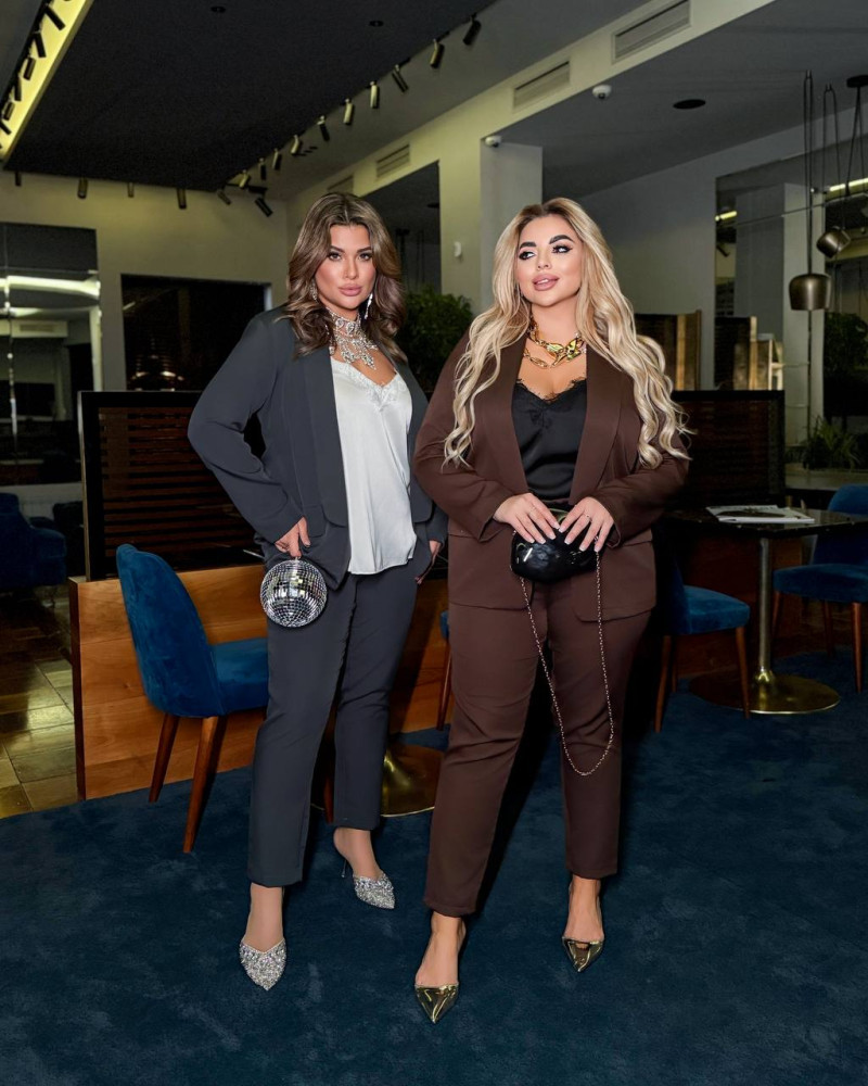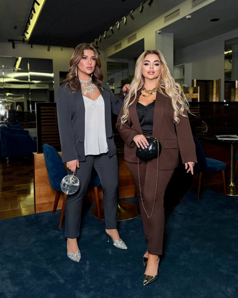 - Цвета: черный костюм с белой майкой, костюм капучино с белой майкой, костюм красный с черной майкой.