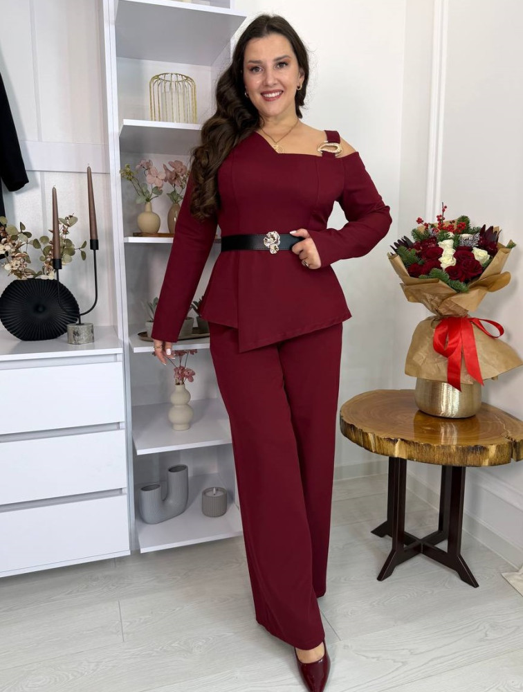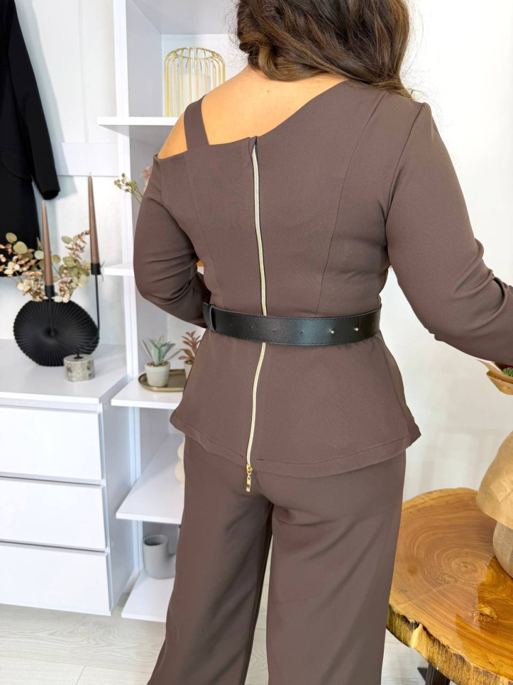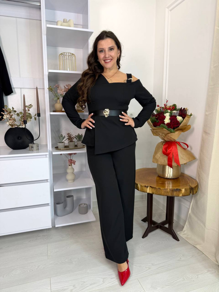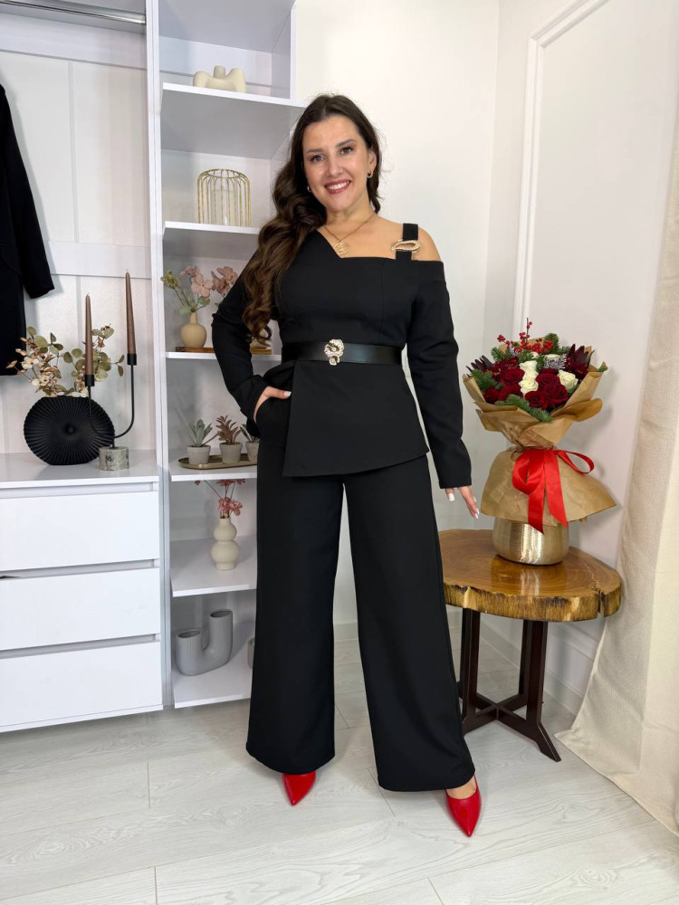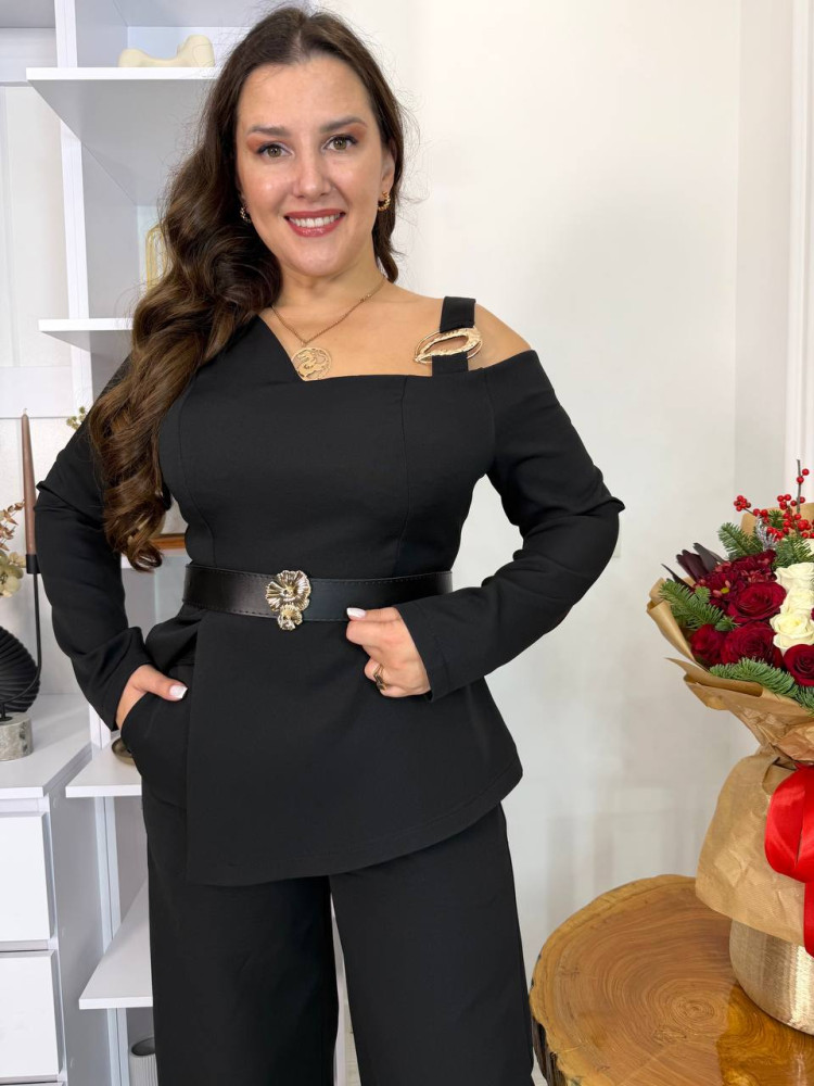 - Блуза с одним обнаженным плечом с украшением, V-образный вырез, низ клеш с разрезом, по спинке золотая молния, черный пояс с украшением идет в комплекте