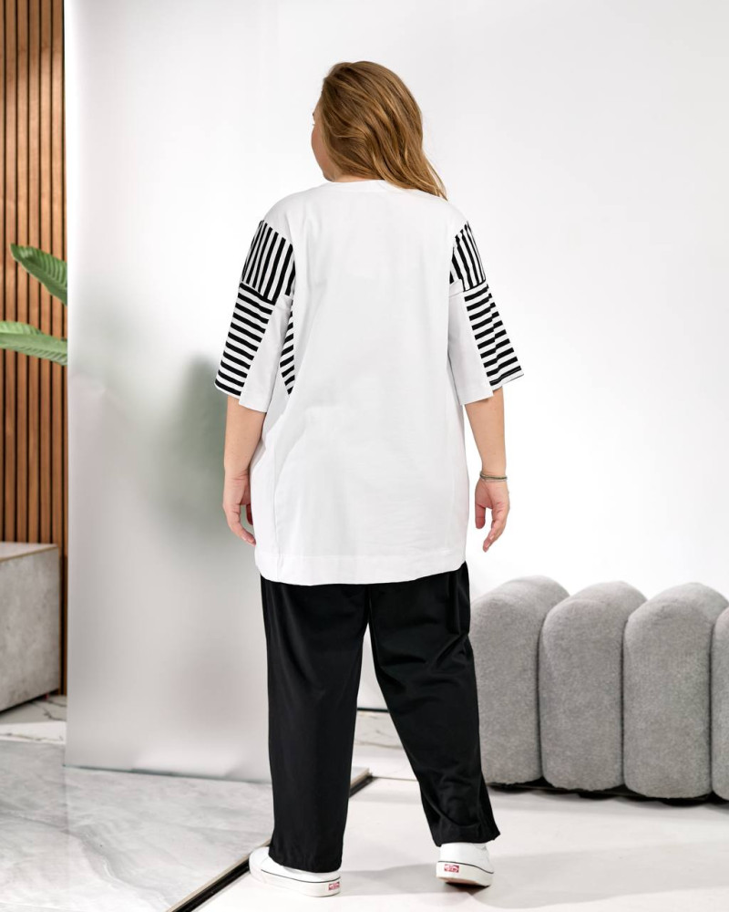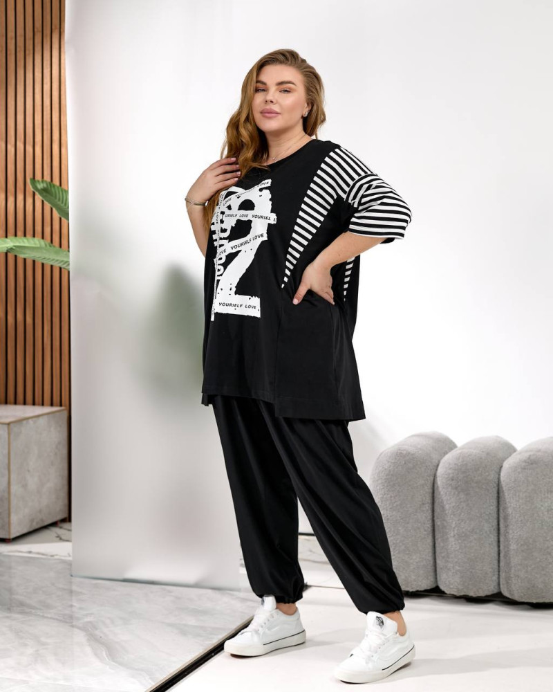 - Замеры: длина футболки 80 см по переду, 85 см сзади, длина брюк 105 см, низ можно стянуть