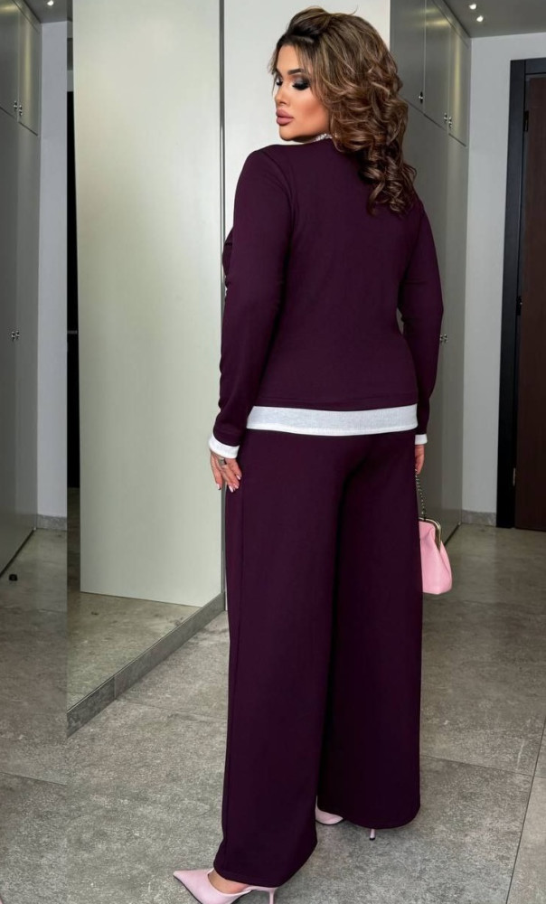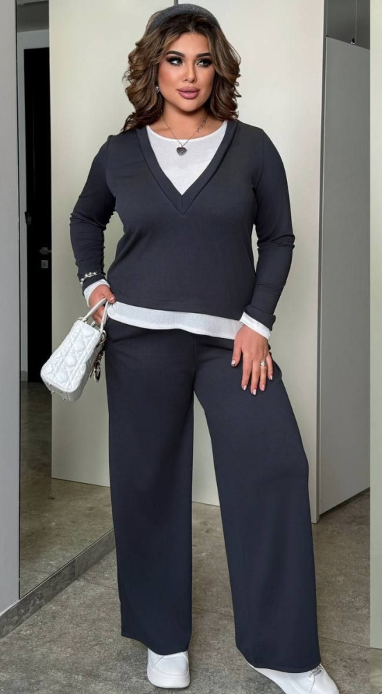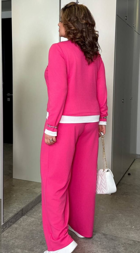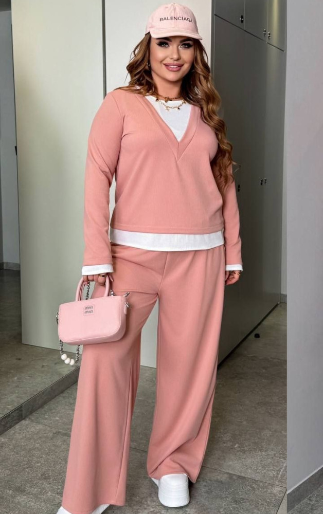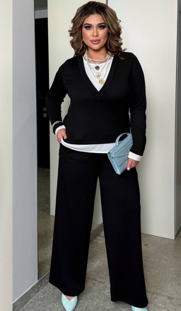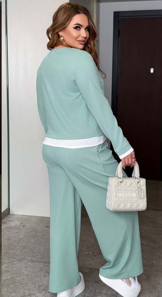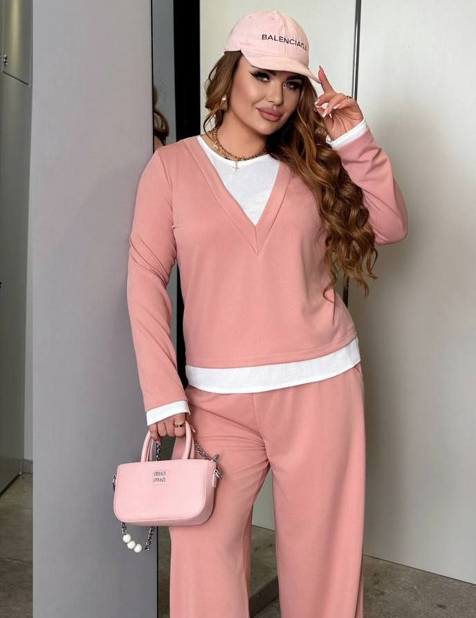 - Брюки с высокой посадкой, пояс на резинке. Кофта прямого покроя, имитация двойки