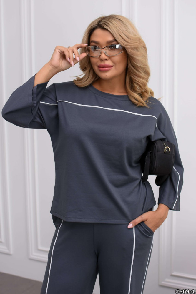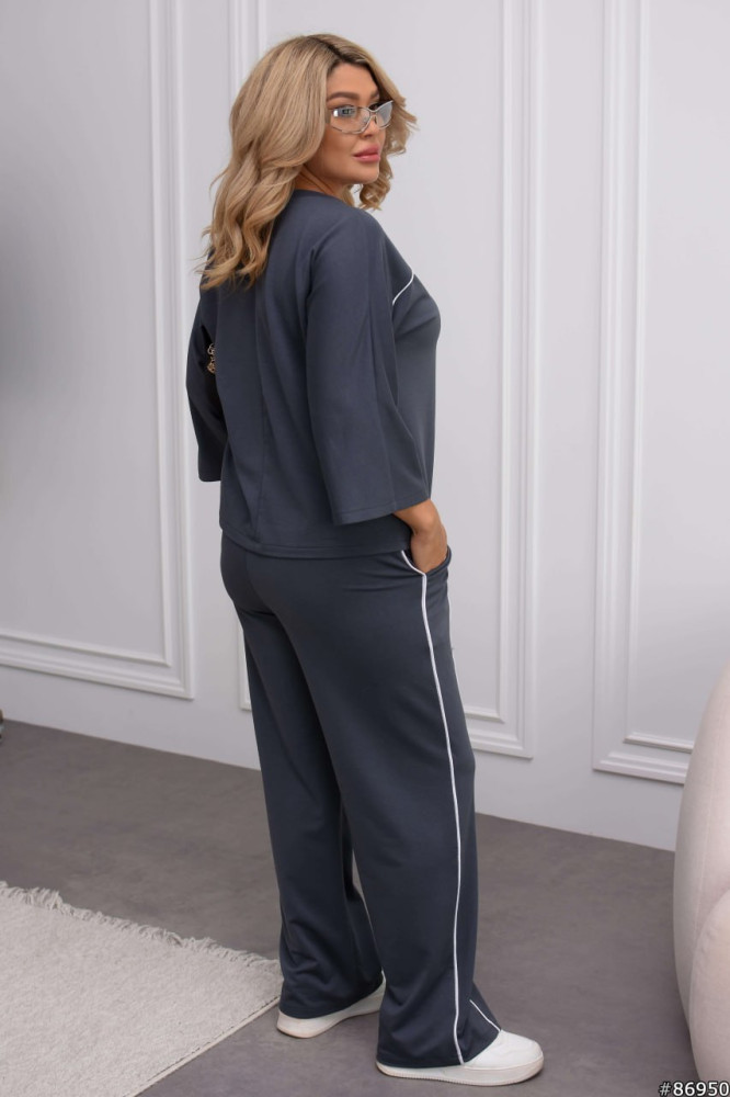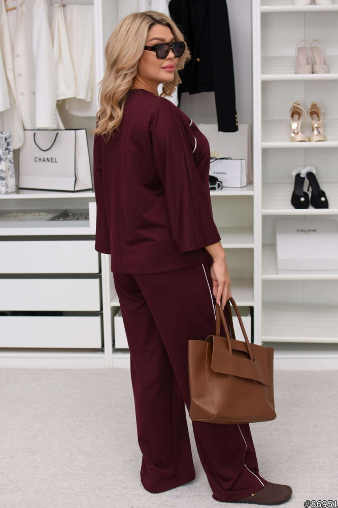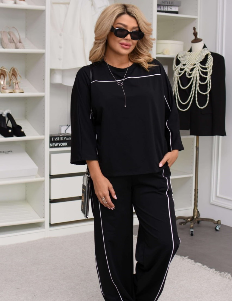 - Костюм-двойка: кофта свободного кроя, рукав три четверти, брюки-клеш на резинке, по бокам кармана. Костюм украшенный кантом.