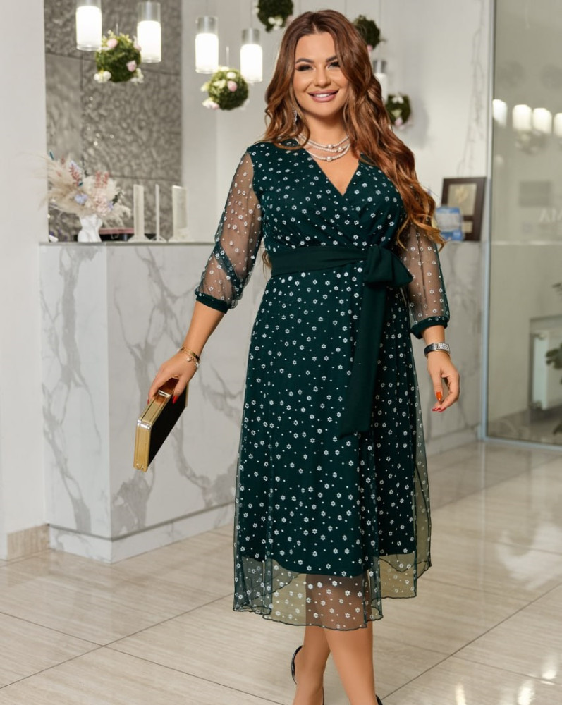 - Перед платьем с имитацией запаха. К платью прилагается съемный пояс из основной ткани.