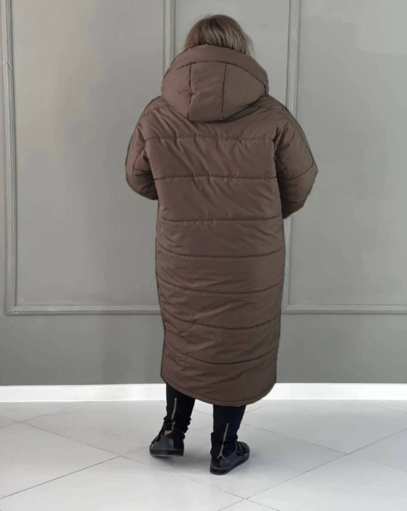 - Ог – 136 см, От – 134 см, ОБ – 134 см, Длина рукава от горловины – 82 см, Объем рукава – 50 см, Манжет (довязь) – 13 см, Высота кармана – 25 см, Длина изделия – 115 см