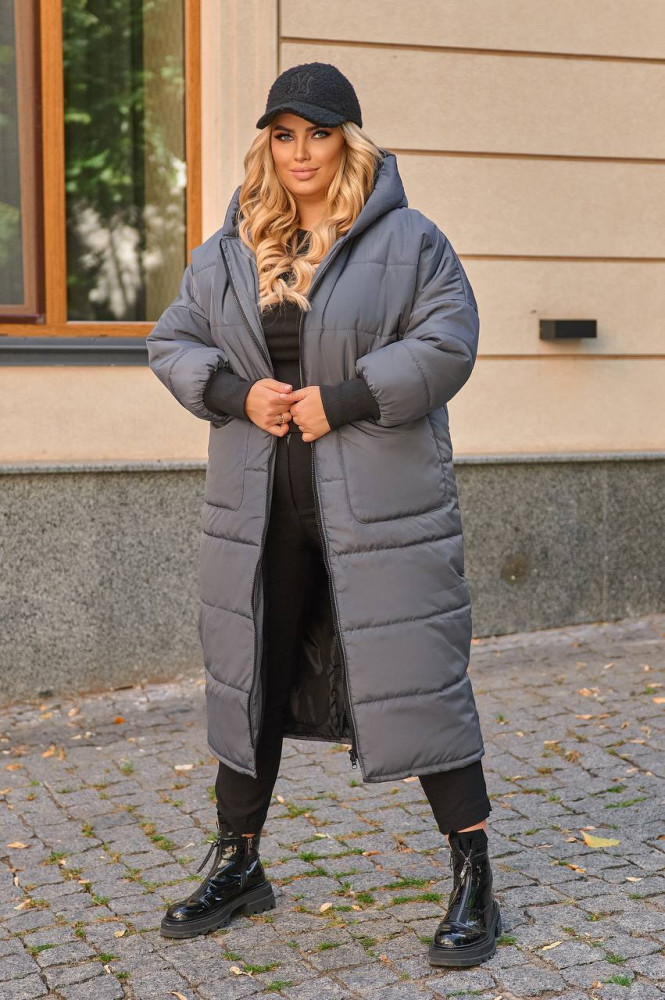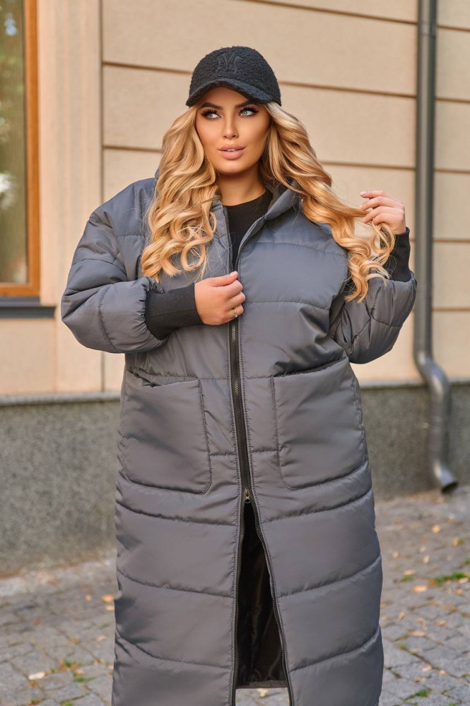 - Ог – 152 см, От – 148 см, ОБ – 148 см, Длина рукава от горловины – 86 см, Объем рукава – 50 см, Манжет (довязь) – 13 см, Высота кармана – 25 см, Длина изделия – 115 см